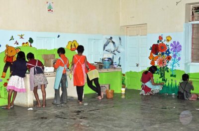 Armed with boxes full of materials and some trepidation as to how we would begin, how the children would react to so large a project, Sarah and I set to work. We needn’t have worried; the children were already fired with energy and enthusiasm! These children are so needy and longing for affection and our concern was, how to get a mural painted under such conditions. Together we managed, and delightful images emerged, some thoughtful and remarkably sophisticated painting was produced by a group of the older girls.