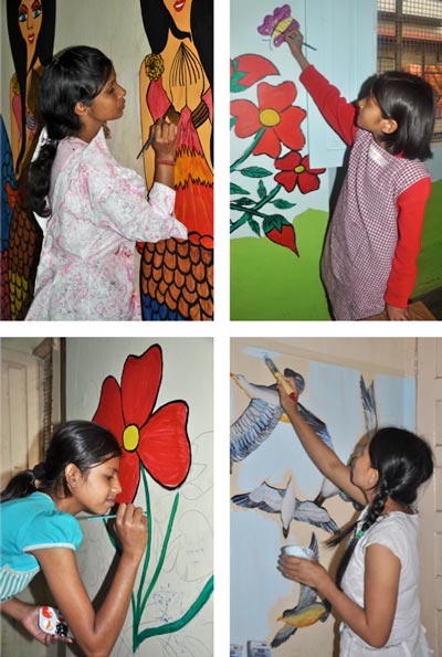 I returned to Kolkata in late January 2011. The children working on the mural had made progress in my absence; lots of drawing had appeared and I saw clearly the passion of the children involved. The children were inspirational. They have suffered the most horrible of abuse and deprivation through brothels, trafficking, being plucked from life on the streets and railway stations by the police, tragic stories so familiar to us in the West; physical and sexual abuse from employers, friends and family members who they should trust.