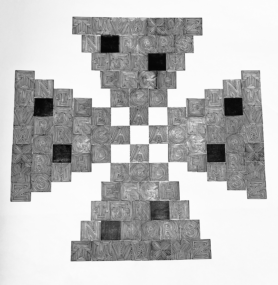 Surprising optical illusions of movement and depth have arisen within my prints when two different blocks are overprinted using colours such as Venetian red and gold. These colours are found traditionally in buildings, manuscripts and on textiles of spiritual significance and readily lend themselves to my subject matter.