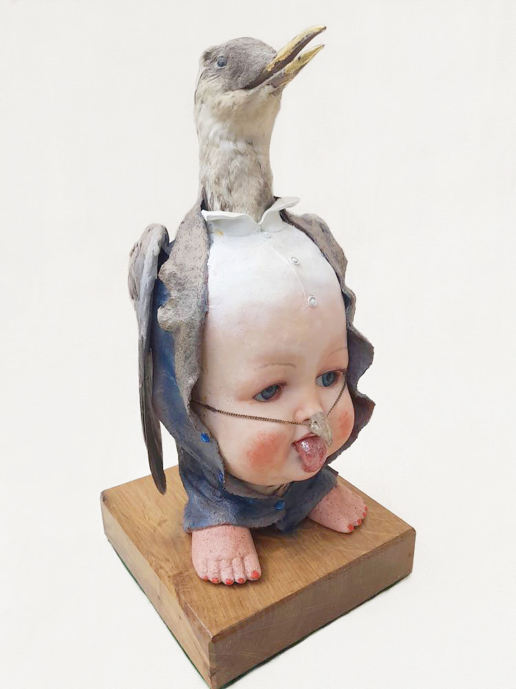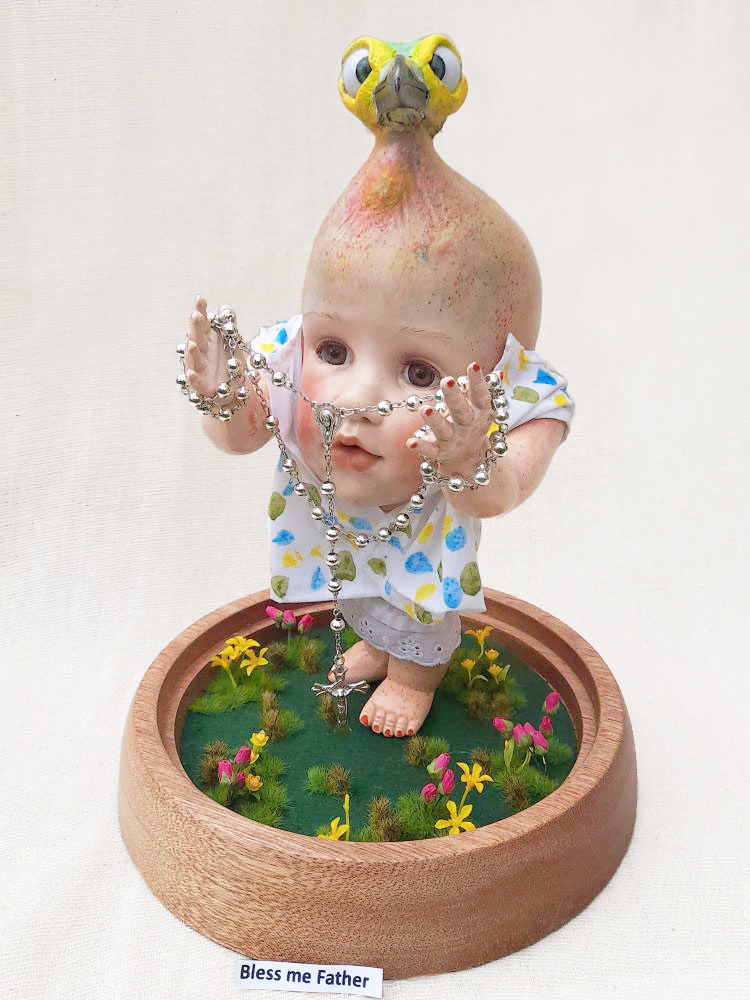 I completed a two year Pre-diploma course at Burslem School of Art in Stoke on Trent, then a three year course in Architectural Ceramics at Nottingham College of Art, during which time, in around 1970, I made my first surreal sculptures. After graduating I started working as a modeller in Muggins Pottery in Leicestershire before moving to Clarecraft Designs in Suffolk as a designer and Pottery manager. Clarecraft also manufactured in resin and plasterware. This experience enabled me to set up as a freelance sculptor, working for many large and small giftware companies in the UK modelling figurines (including the Clarecraft Discworld figures), cottages, fragrant plasterware, models for ceramics, plaques, dolls, fridge magnets and walking stick handles. After the downturn in UK manufacturing I taught myself the art of traditional pargeting (decorative freehand modelling in lime plaster), which I practised for many years all over the UK. During this period I also designed and produced many village signs, mainly in East Anglia and surrounding counties. After retirement I took the opportunity to return to my surreal sculpting, taking up the reins where I had left off all those years before.
