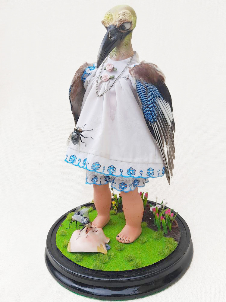 My work explores the human condition by taking a sideways step from reality. Inspiration can range from a simple phrase or saying to a personal incident. I like juxtaposing and combining materials and ideas to give my pieces an unsettling edge or to challenge a belief. Although I am in general control of where and how the work will look, serendipity plays its own part, always with surprising results. The whole story is for the viewer to interpret for themselves.