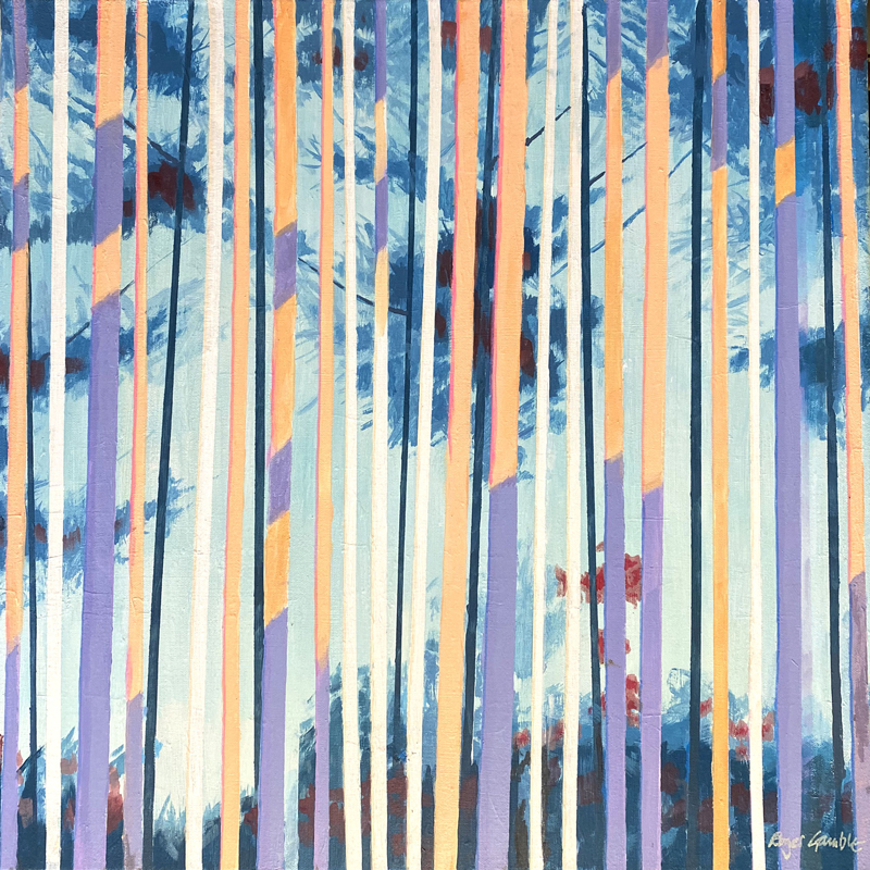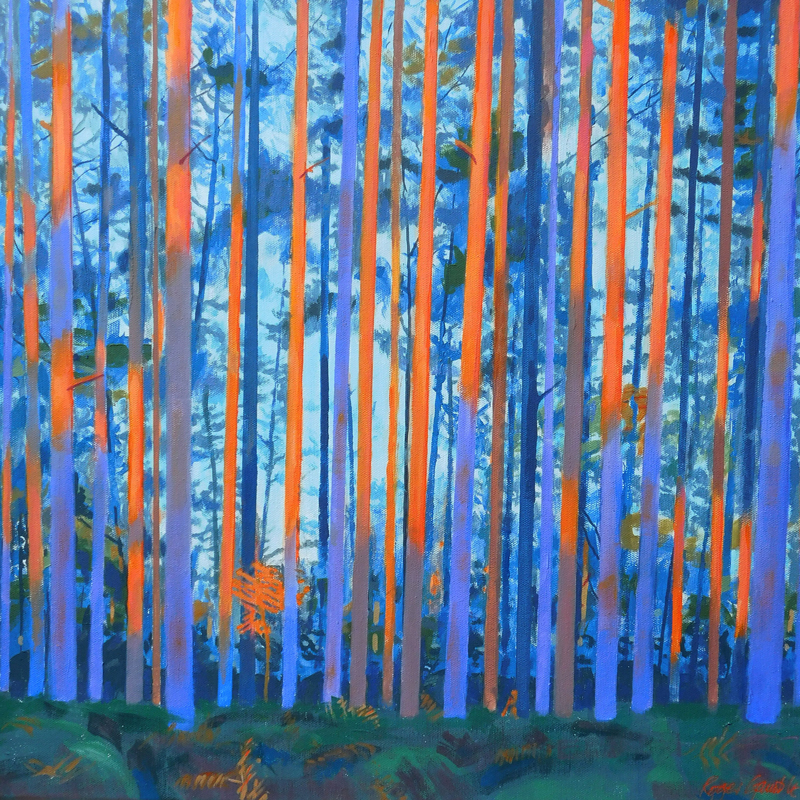 I have been for over a half-century a figurative painter. Looking at my back catalogue I can see that the subject matter, and my treatment of it, has undergone more changes than I have imagined. These days I am drawn towards the opportunities presented by the essential elements of my local landscape; the spinneys of birch, the typical Breckland rows of gnarled pines, and the vast, silent conifers of Thetford Forest. These provide me with a never-ending supply of ideas. I enjoy the challenges of deconstructing and reconstructing these ideas, and the magic of finding out what happens. Just occasionally, I like to present myself with the challenge of producing work in a totally different style, a leap in the dark, ‘let’s see what happens!’ One result has been a return to the human form and face,