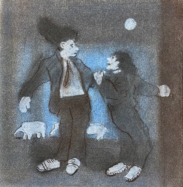 My work is concerned with meanings in social narrative – incongruous, ambiguous, awkward, humorous, absurd, political or mysterious, even meaningless. I love the power of the narrative image. Sometimes I paint portraits in oils or make watercolour landscapes, but my main practice is on paper with pastels, inks, watercolour, conté crayon and charcoal. I also draw prolifically in sketchbooks – probably what I do most of.