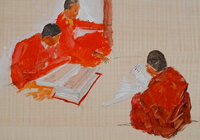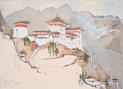 Between 2005-2007 Doug travelled to Bhutan, the land of the Thunder Dragon, following the route of the artist, astronomer and director of the East India Company, Samuel Davis (1760-1819), who visited Bhutan in 1783. Doug’s Bhutan portfolio is a comprehensive contemporary collection of drawings and paintings of the landscape, life and architecture of all the 20 Dzongs (Buddhist monasteries) of Bhutan.
