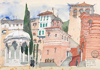 Doug has visited Mount Athos in Greece twelve times, walking throughout the holy mountain and visiting all twenty Orthodox monasteries. Doug’s travels in Greece followed those of the artist and Russian monk, Vasileios Gregorovic Barsky, who in 1745 visited Mount Athos and recorded the life, landscape and architecture of the holy mountain. Doug Patterson’s Mount Athos portfolio consists of over 200 artworks, including sketches, water-colours and oil paintings. The Mount Athos series of works were recently exhibited in Saloniki in Greece, the exhibition then travels on to Athens and Istanbul, Turkey.