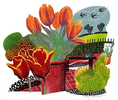 Cutting out the design is done with different sized gouges and V-tools. Once the cutting is complete the lino is mounted on board to strengthen it and is then ready for inking. I prefer to ink up my lino blocks in one go, using different sized rollers and sometimes brushes for intricate areas for each separate colour. Sometimes a subject may be suited to the traditional reduction method of linoprinting which produces a more hard-edged quality in the final image.